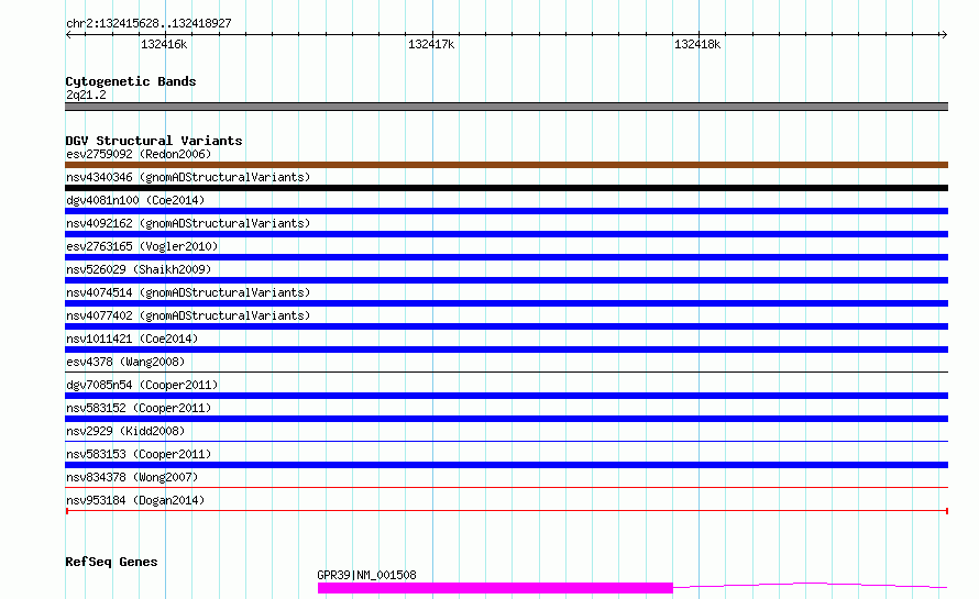 | | Variant Type | CNV deletion | | Copy Number | | | Allele State | | | Allele Origin | | | Probe Count | | | Validation Flag | | | Merged Status | M | | Merged Variants | | | Supporting Variants | nssv3003032 | | Samples | BILGI_BIOE | | Known Genes | GPR39 | | Method | Sequencing | | Analysis | | | Platform | Illumina HiSeq 2000 | | Comments | | | Reference | Dogan_et_al_2014 | | Pubmed ID | 24416366 | | Accession Number(s) | nsv953184