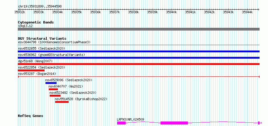 Variant DetailsVariant: nsv953287| Internal ID | 17302161 | | Landmark | | | Location Information | | | Cytoband | 19q13.12 | | Allele length | | Assembly | Allele length | | hg38 | 12700 | | hg19 | 12700 |