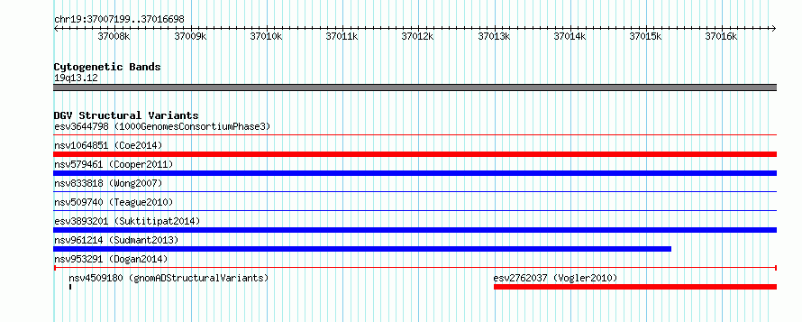 Variant DetailsVariant: nsv953291Internal ID | 16955478 | Landmark | | Location Information | | Cytoband | 19q13.12 | Allele length | Assembly | Allele length | hg38 | 9500 | hg19 | 9500 |