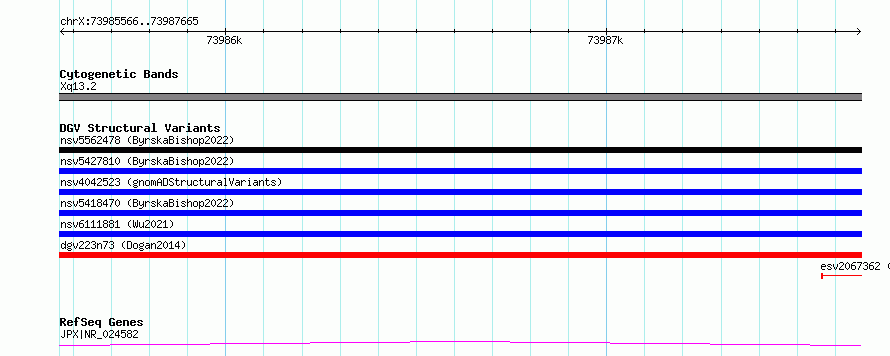 Variant DetailsVariant: nsv953431| Internal ID | 17302305 | | Landmark | | | Location Information | | | Cytoband | Xq13.2 | | Allele length | | Assembly | Allele length | | hg38 | 2100 | | hg19 | 2100 |