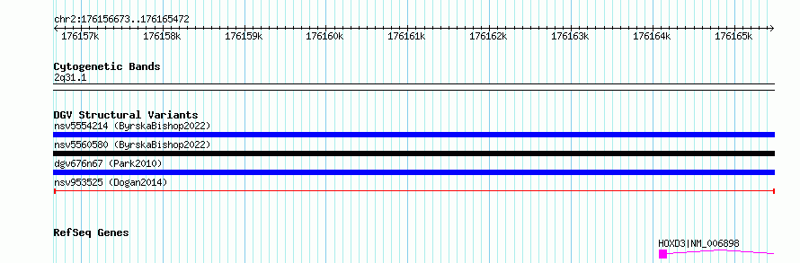 Variant DetailsVariant: nsv953525| Internal ID | 17302399 | | Landmark | | | Location Information | | | Cytoband | 2q31.1 | | Allele length | | Assembly | Allele length | | hg38 | 8800 | | hg19 | 8800 |