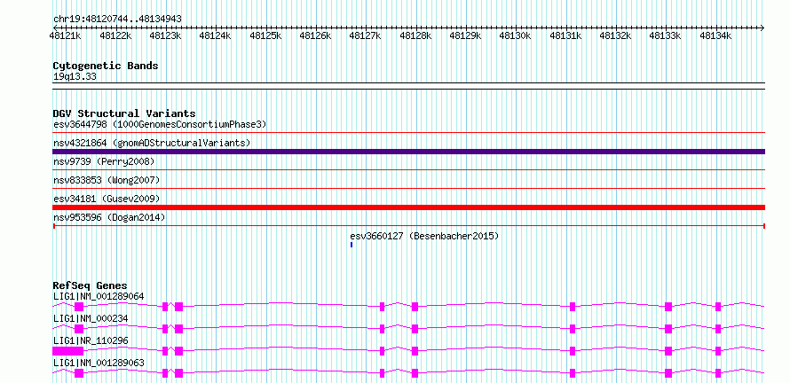 Variant DetailsVariant: nsv953596| Internal ID | 16955783 | | Landmark | | | Location Information | | | Cytoband | 19q13.33 | | Allele length | | Assembly | Allele length | | hg38 | 14200 | | hg19 | 14200 |