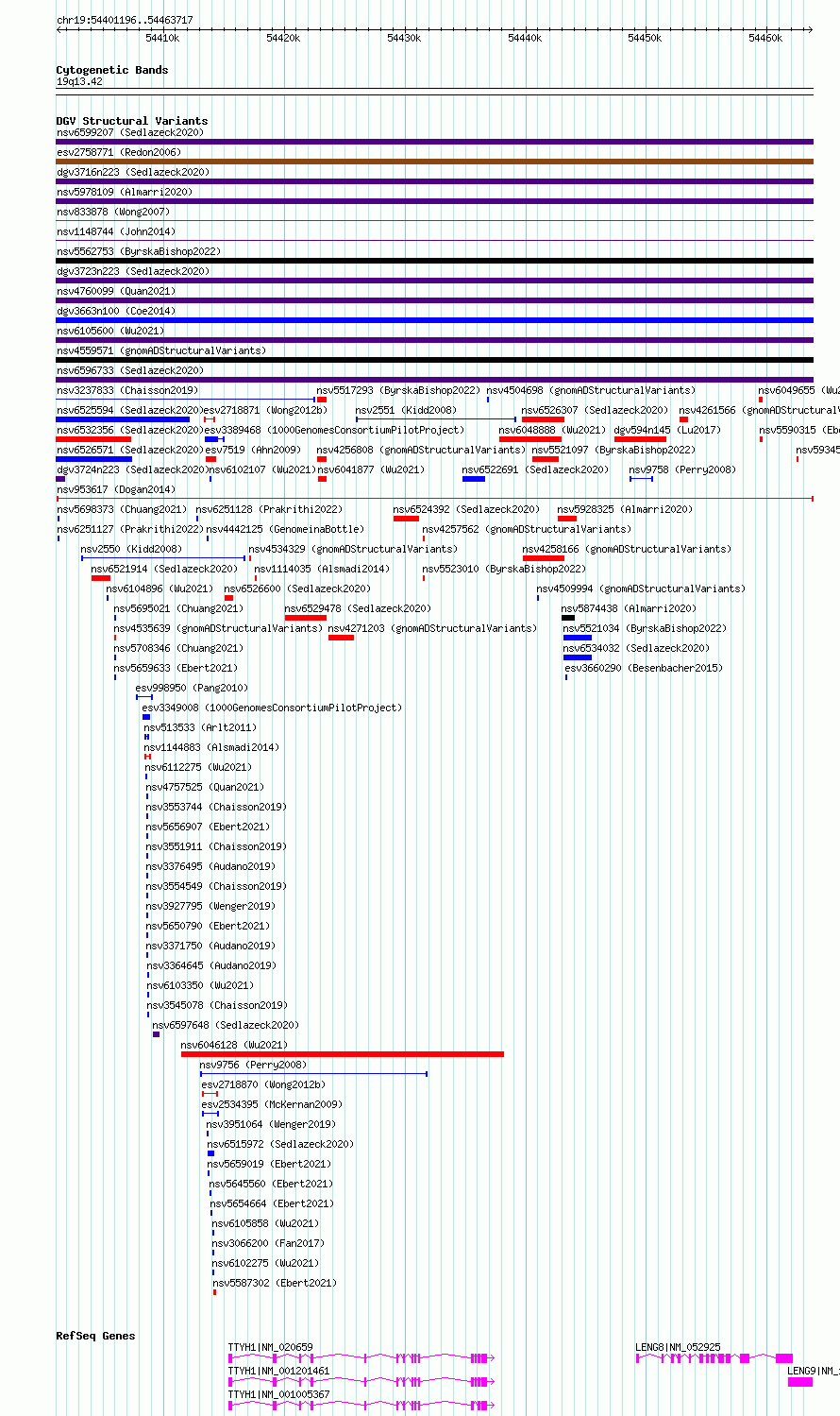 Variant DetailsVariant: nsv953617| Internal ID | 17302491 | | Landmark | | | Location Information | | | Cytoband | 19q13.42 | | Allele length | | Assembly | Allele length | | hg38 | 62522 | | hg19 | 62100 |
