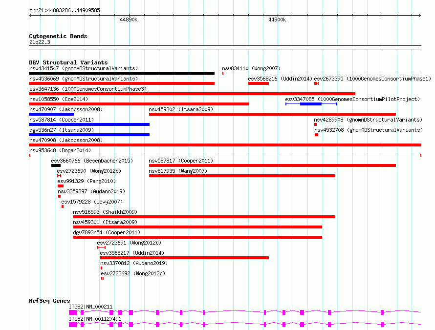 Variant DetailsVariant: nsv953648| Internal ID | 16955835 | | Landmark | | | Location Information | | | Cytoband | 21q22.3 | | Allele length | | Assembly | Allele length | | hg38 | 26300 | | hg19 | 26300 |