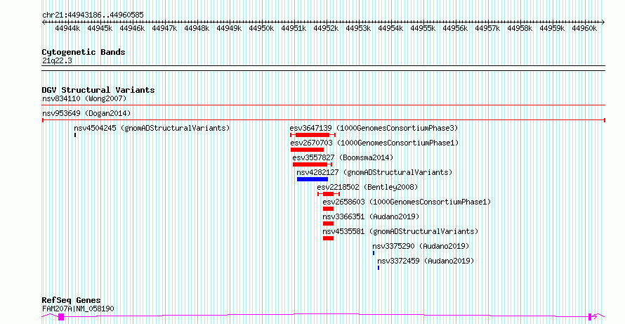 Variant DetailsVariant: nsv953649| Internal ID | 16955836 | | Landmark | | | Location Information | | | Cytoband | 21q22.3 | | Allele length | | Assembly | Allele length | | hg38 | 17400 | | hg19 | 17400 |