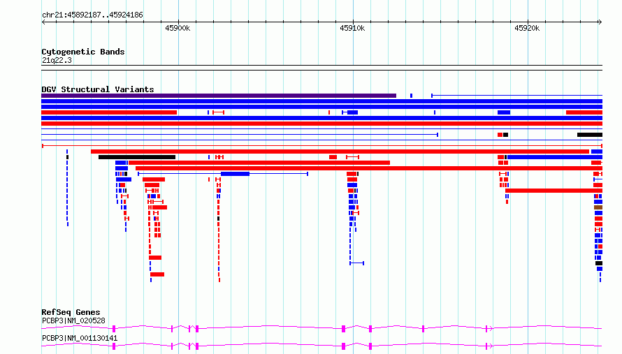 Variant DetailsVariant: nsv953656| Internal ID | 17302530 | | Landmark | | | Location Information | | | Cytoband | 21q22.3 | | Allele length | | Assembly | Allele length | | hg38 | 32000 | | hg19 | 32000 |