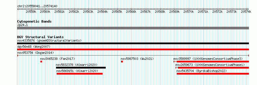 Variant DetailsVariant: nsv953754| Internal ID | 17302628 | | Landmark | | | Location Information | | | Cytoband | 2p24.1 | | Allele length | | Assembly | Allele length | | hg38 | 16100 | | hg19 | 16100 |