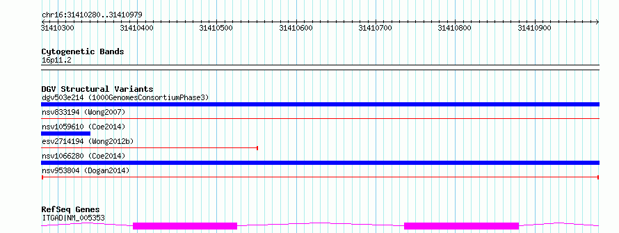 | Variant Type | CNV deletion | Copy Number | | Allele State | | Allele Origin | | Probe Count | | Validation Flag | | Merged Status | M | Merged Variants | | Supporting Variants | nssv3000077 | Samples | BILGI_BIOE | Known Genes | ITGAD | Method | Sequencing | Analysis | | Platform | Illumina HiSeq 2000 | Comments | | Reference | Dogan_et_al_2014 | Pubmed ID | 24416366 | Accession Number(s) | nsv953804