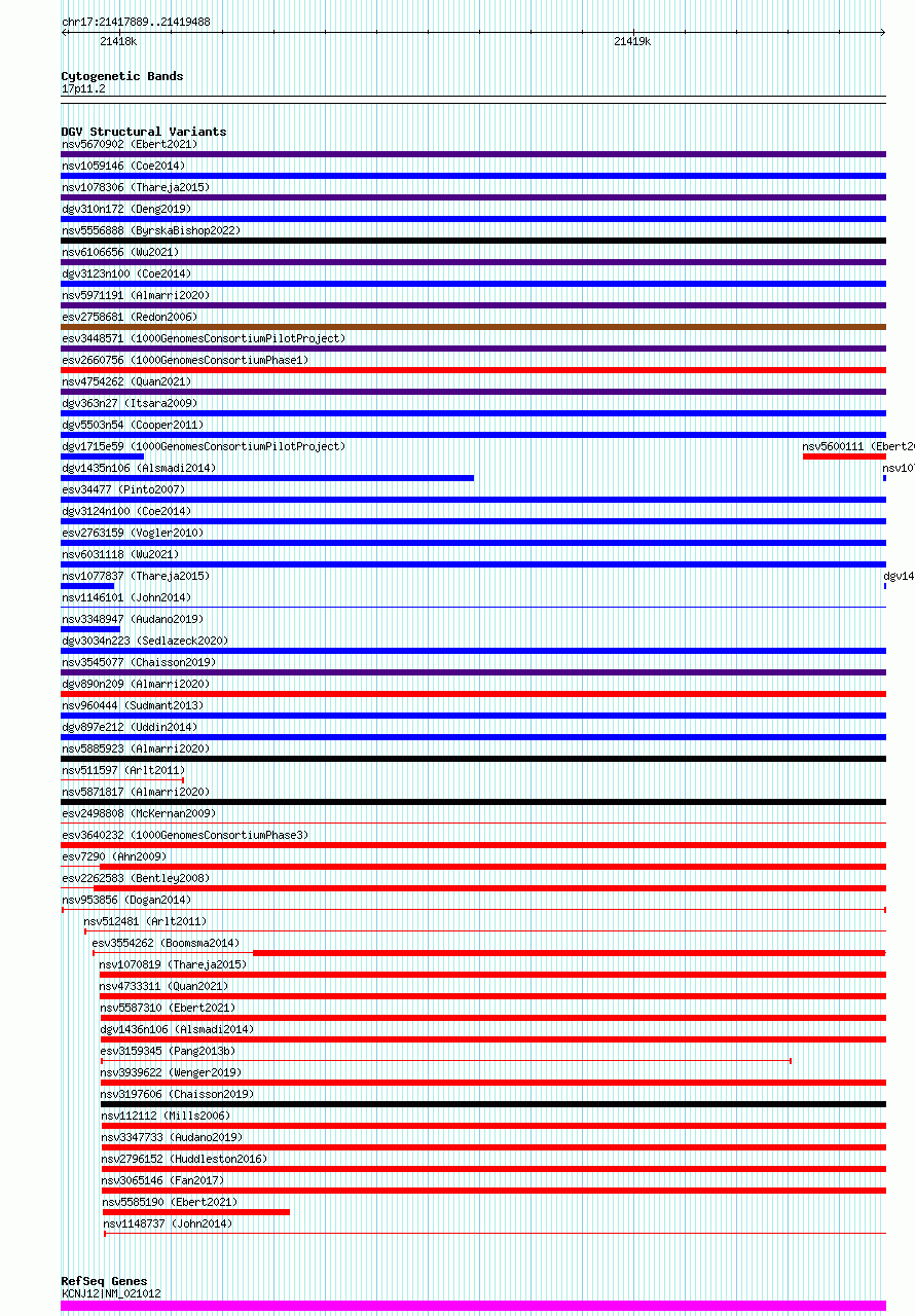 Variant DetailsVariant: nsv953856| Internal ID | 17302730 | | Landmark | | | Location Information | | | Cytoband | 17p11.2 | | Allele length | | Assembly | Allele length | | hg38 | 1600 | | hg19 | 1600 |