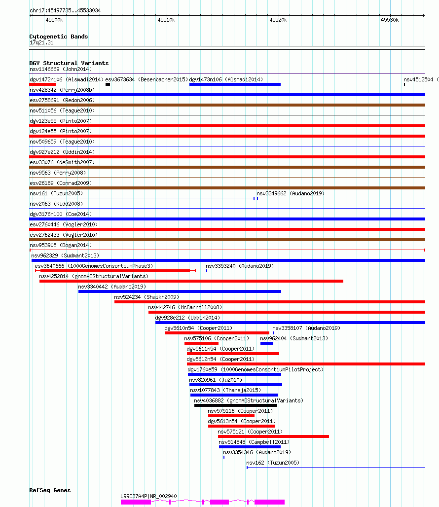 Variant DetailsVariant: nsv953905Internal ID | 16956092 | Landmark | | Location Information | | Cytoband | 17q21.31 | Allele length | Assembly | Allele length | hg38 | 35300 | hg19 | 35300 |