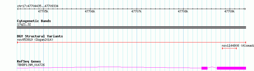 | Variant Type | CNV deletion | Copy Number | | Allele State | | Allele Origin | | Probe Count | | Validation Flag | | Merged Status | M | Merged Variants | | Supporting Variants | nssv2998765 | Samples | BILGI_BIOE | Known Genes | TBKBP1 | Method | Sequencing | Analysis | | Platform | Illumina HiSeq 2000 | Comments | | Reference | Dogan_et_al_2014 | Pubmed ID | 24416366 | Accession Number(s) | nsv953919