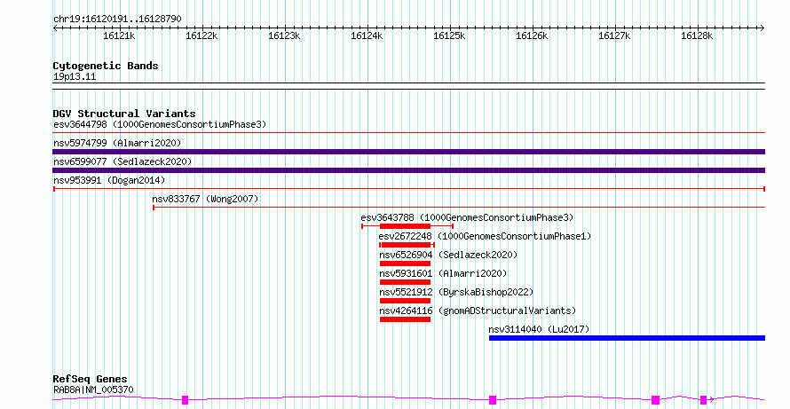 Variant DetailsVariant: nsv953991| Internal ID | 17302865 | | Landmark | | | Location Information | | | Cytoband | 19p13.12 | | Allele length | | Assembly | Allele length | | hg38 | 8600 | | hg19 | 8600 |