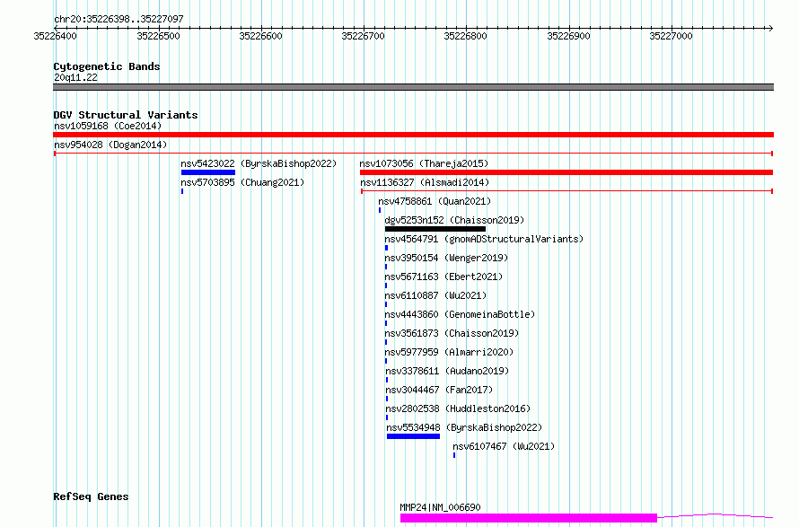 Variant DetailsVariant: nsv954028| Internal ID | 17302902 | | Landmark | | | Location Information | | | Cytoband | 20q11.22 | | Allele length | | Assembly | Allele length | | hg38 | 700 | | hg19 | 700 |