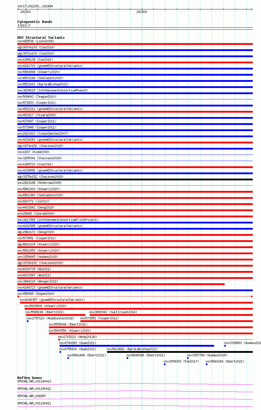 Variant DetailsVariant: nsv954589| Internal ID | 17303463 | | Landmark | | | Location Information | | | Cytoband | 17p13.3 | | Allele length | | Assembly | Allele length | | hg38 | 202 | | hg19 | 202 |