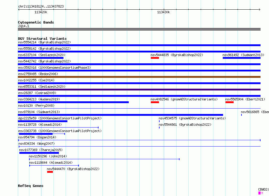 Variant DetailsVariant: nsv954794| Internal ID | 17303667 | | Landmark | | | Location Information | | | Cytoband | 2q13 | | Allele length | | Assembly | Allele length | | hg38 | 19700 | | hg19 | 19700 |