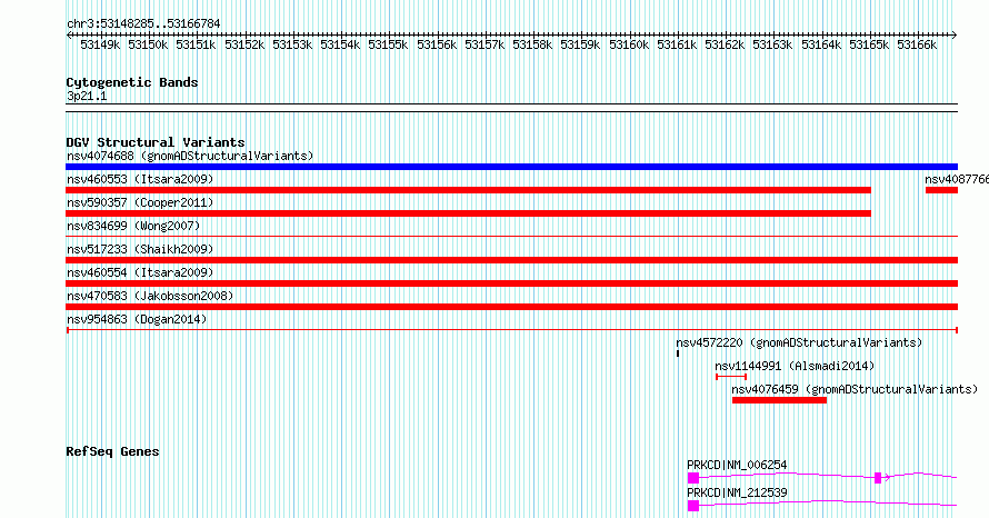 Variant DetailsVariant: nsv954863| Internal ID | 16957050 | | Landmark | | | Location Information | | | Cytoband | 3p21.1 | | Allele length | | Assembly | Allele length | | hg38 | 18500 | | hg19 | 18500 |
