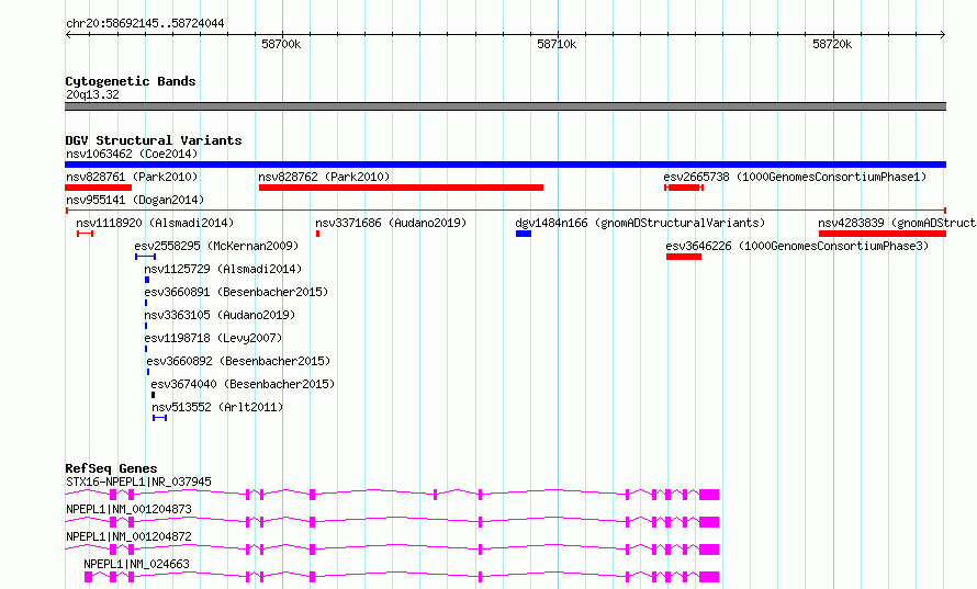 Variant DetailsVariant: nsv955141| Internal ID | 16957328 | | Landmark | | | Location Information | | | Cytoband | 20q13.32 | | Allele length | | Assembly | Allele length | | hg38 | 31900 | | hg19 | 31900 |