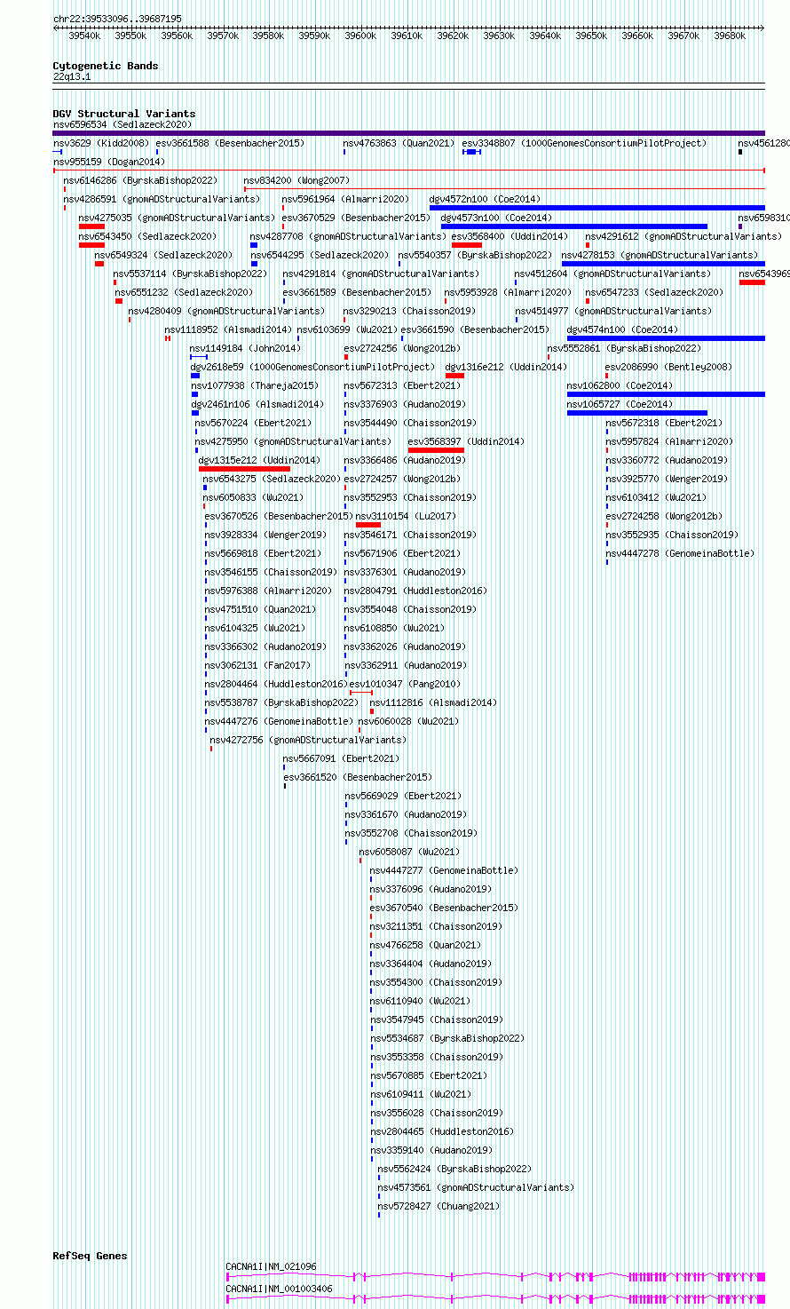 Variant DetailsVariant: nsv955159| Internal ID | 17304032 | | Landmark | | | Location Information | | | Cytoband | 22q13.1 | | Allele length | | Assembly | Allele length | | hg38 | 154100 | | hg19 | 154100 |