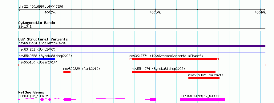 Variant DetailsVariant: nsv955160| Internal ID | 17304033 | | Landmark | | | Location Information | | | Cytoband | 22q13.1 | | Allele length | | Assembly | Allele length | | hg38 | 23400 | | hg19 | 23400 |