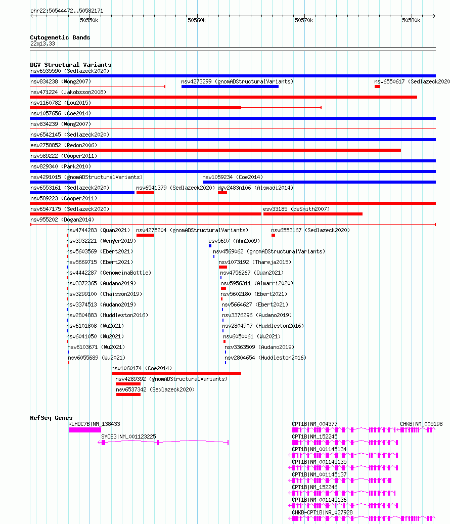 Variant DetailsVariant: nsv955202| Internal ID | 17304075 | | Landmark | | | Location Information | | | Cytoband | 22q13.33 | | Allele length | | Assembly | Allele length | | hg38 | 37700 | | hg19 | 37700 |