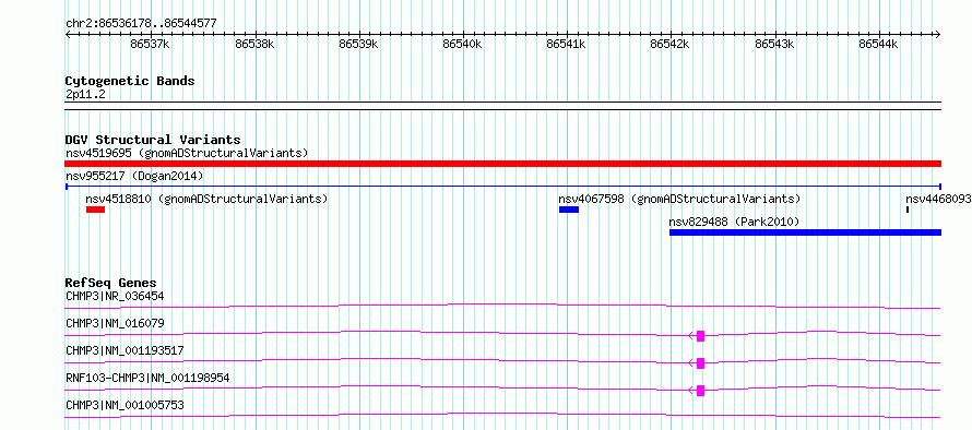 | Variant Type | CNV duplication | Copy Number | | Allele State | | Allele Origin | | Probe Count | | Validation Flag | | Merged Status | M | Merged Variants | | Supporting Variants | nssv3001761 | Samples | BILGI_BIOE | Known Genes | CHMP3, RNF103-CHMP3 | Method | Sequencing | Analysis | | Platform | Illumina HiSeq 2000 | Comments | | Reference | Dogan_et_al_2014 | Pubmed ID | 24416366 | Accession Number(s) | nsv955217