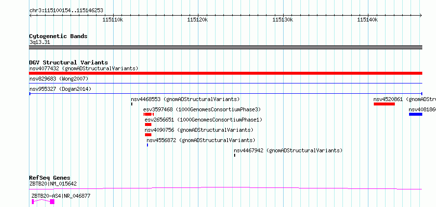 | Variant Type | CNV duplication | Copy Number | | Allele State | | Allele Origin | | Probe Count | | Validation Flag | | Merged Status | M | Merged Variants | | Supporting Variants | nssv3001444 | Samples | BILGI_BIOE | Known Genes | ZBTB20 | Method | Sequencing | Analysis | | Platform | Illumina HiSeq 2000 | Comments | | Reference | Dogan_et_al_2014 | Pubmed ID | 24416366 | Accession Number(s) | nsv955327