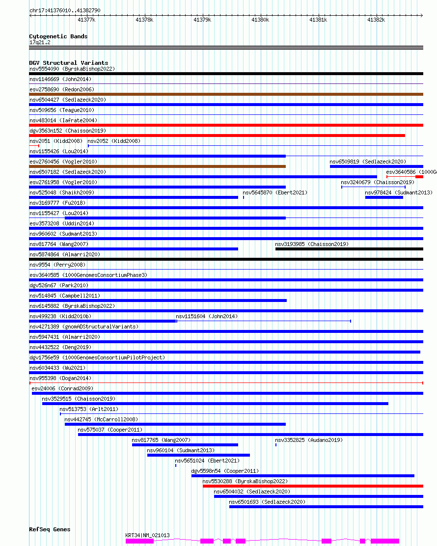 Variant DetailsVariant: nsv955398| Internal ID | 17304271 | | Landmark | | | Location Information | | | Cytoband | 17q21.2 | | Allele length | | Assembly | Allele length | | hg38 | 6781 | | hg19 | 6781 |