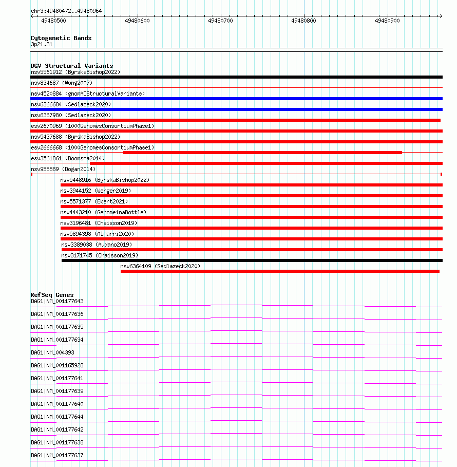 Variant DetailsVariant: nsv955589| Internal ID | 17304462 | | Landmark | | | Location Information | | | Cytoband | 3p21.31 | | Allele length | | Assembly | Allele length | | hg38 | 493 | | hg19 | 493 |