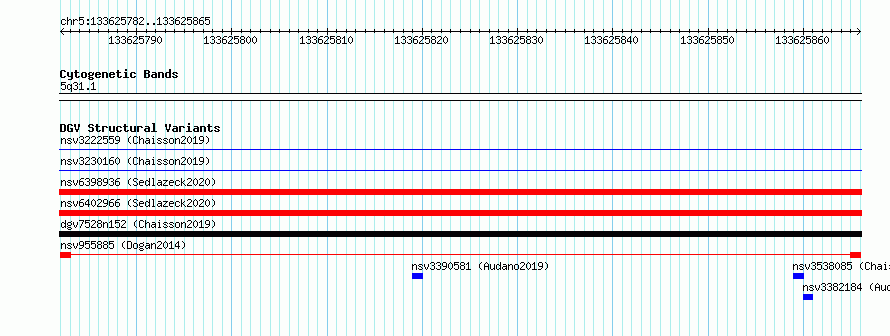 Variant DetailsVariant: nsv955885| Internal ID | 17304758 | | Landmark | | | Location Information | | | Cytoband | 5q31.1 | | Allele length | | Assembly | Allele length | | hg38 | 84 | | hg19 | 84 |