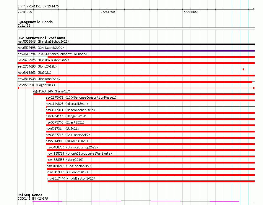 Variant DetailsVariant: nsv956010| Internal ID | 17304883 | | Landmark | | | Location Information | | | Cytoband | 7q11.23 | | Allele length | | Assembly | Allele length | | hg38 | 286 | | hg19 | 286 |