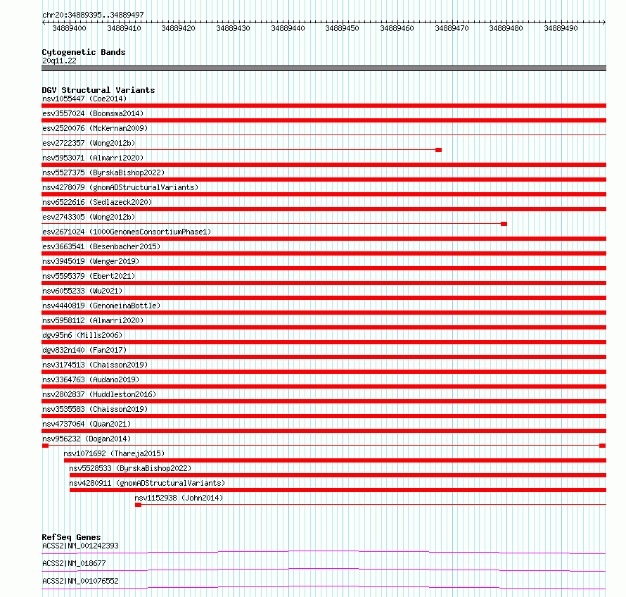 Variant DetailsVariant: nsv956232| Internal ID | 17305105 | | Landmark | | | Location Information | | | Cytoband | 20q11.22 | | Allele length | | Assembly | Allele length | | hg38 | 103 | | hg19 | 103 |