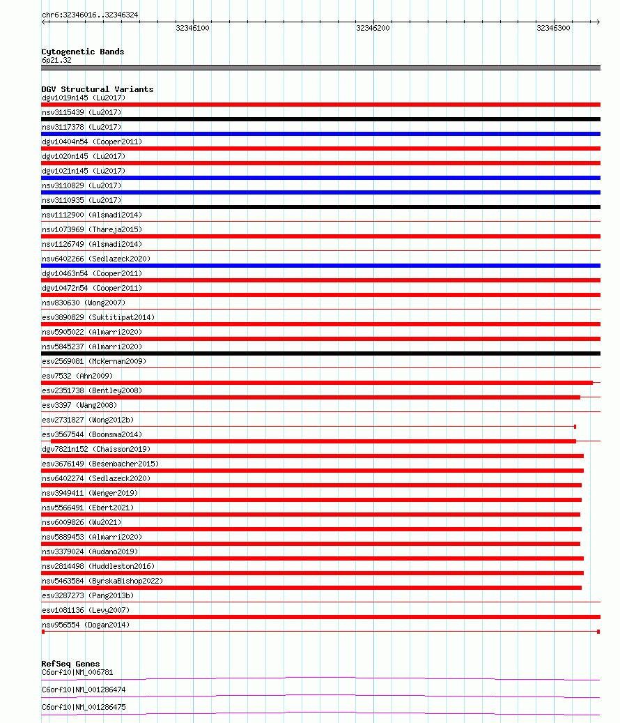 Variant DetailsVariant: nsv956554| Internal ID | 17305427 | | Landmark | | | Location Information | | | Cytoband | 6p21.32 | | Allele length | | Assembly | Allele length | | hg38 | 309 | | hg19 | 309 |