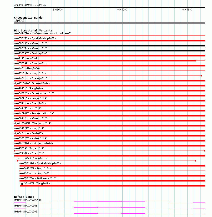 Variant DetailsVariant: nsv956596| Internal ID | 17305469 | | Landmark | | | Location Information | | | Cytoband | 19p13.2 | | Allele length | | Assembly | Allele length | | hg38 | 294 | | hg19 | 294 |