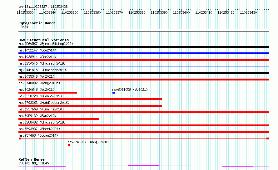 Variant DetailsVariant: nsv957463| Internal ID | 17306336 | | Landmark | | | Location Information | | | Cytoband | 13q34 | | Allele length | | Assembly | Allele length | | hg38 | 112 | | hg19 | 112 |