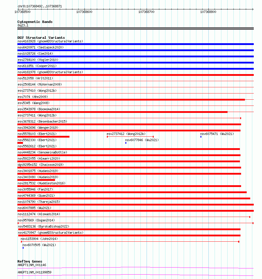Variant DetailsVariant: nsv957669| Internal ID | 17306542 | | Landmark | | | Location Information | | | Cytoband | 8q23.1 | | Allele length | | Assembly | Allele length | | hg38 | 380 | | hg19 | 380 |