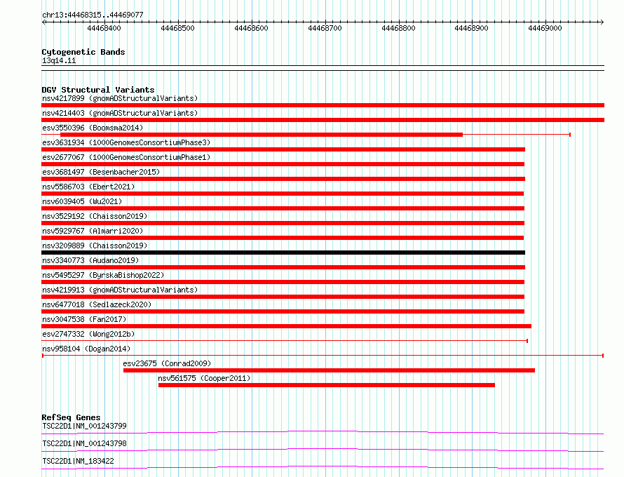 Variant DetailsVariant: nsv958104| Internal ID | 17306977 | | Landmark | | | Location Information | | | Cytoband | 13q14.11 | | Allele length | | Assembly | Allele length | | hg38 | 763 | | hg19 | 763 |