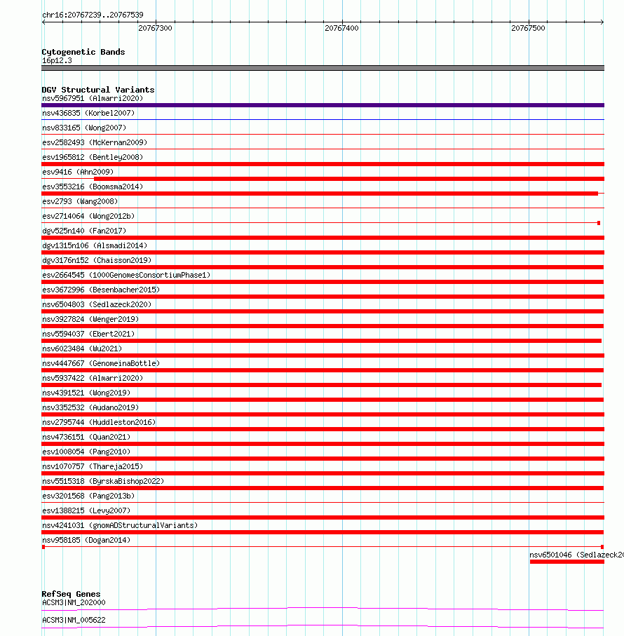 Variant DetailsVariant: nsv958185| Internal ID | 17307058 | | Landmark | | | Location Information | | | Cytoband | 16p12.3 | | Allele length | | Assembly | Allele length | | hg38 | 301 | | hg19 | 301 |