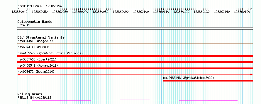 Variant DetailsVariant: nsv958472| Internal ID | 17307345 | | Landmark | | | Location Information | | | Cytoband | 8q24.13 | | Allele length | | Assembly | Allele length | | hg38 | 116 | | hg19 | 116 |