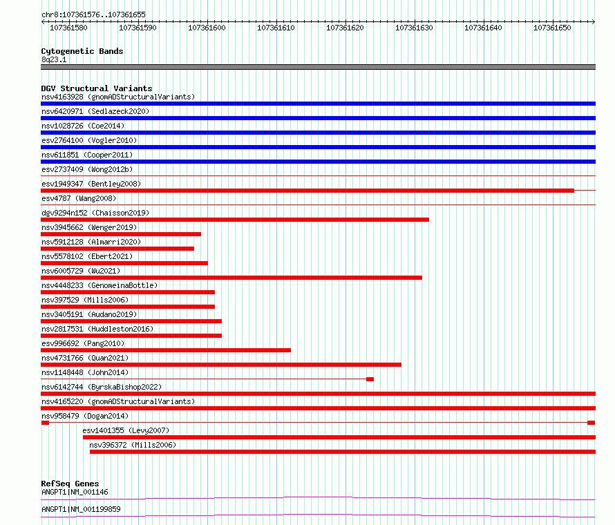 Variant DetailsVariant: nsv958479| Internal ID | 17307352 | | Landmark | | | Location Information | | | Cytoband | 8q23.1 | | Allele length | | Assembly | Allele length | | hg38 | 80 | | hg19 | 80 |