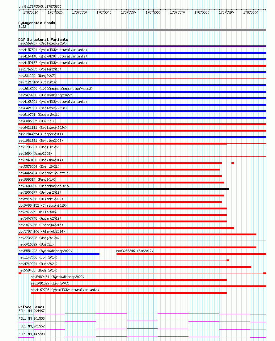 Variant DetailsVariant: nsv958486| Internal ID | 17307359 | | Landmark | | | Location Information | | | Cytoband | 8p22 | | Allele length | | Assembly | Allele length | | hg38 | 101 | | hg19 | 101 |
