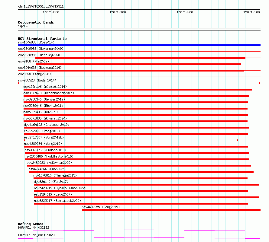 Variant DetailsVariant: nsv958528| Internal ID | 17307401 | | Landmark | | | Location Information | | | Cytoband | 1q21.3 | | Allele length | | Assembly | Allele length | | hg38 | 361 | | hg19 | 361 |