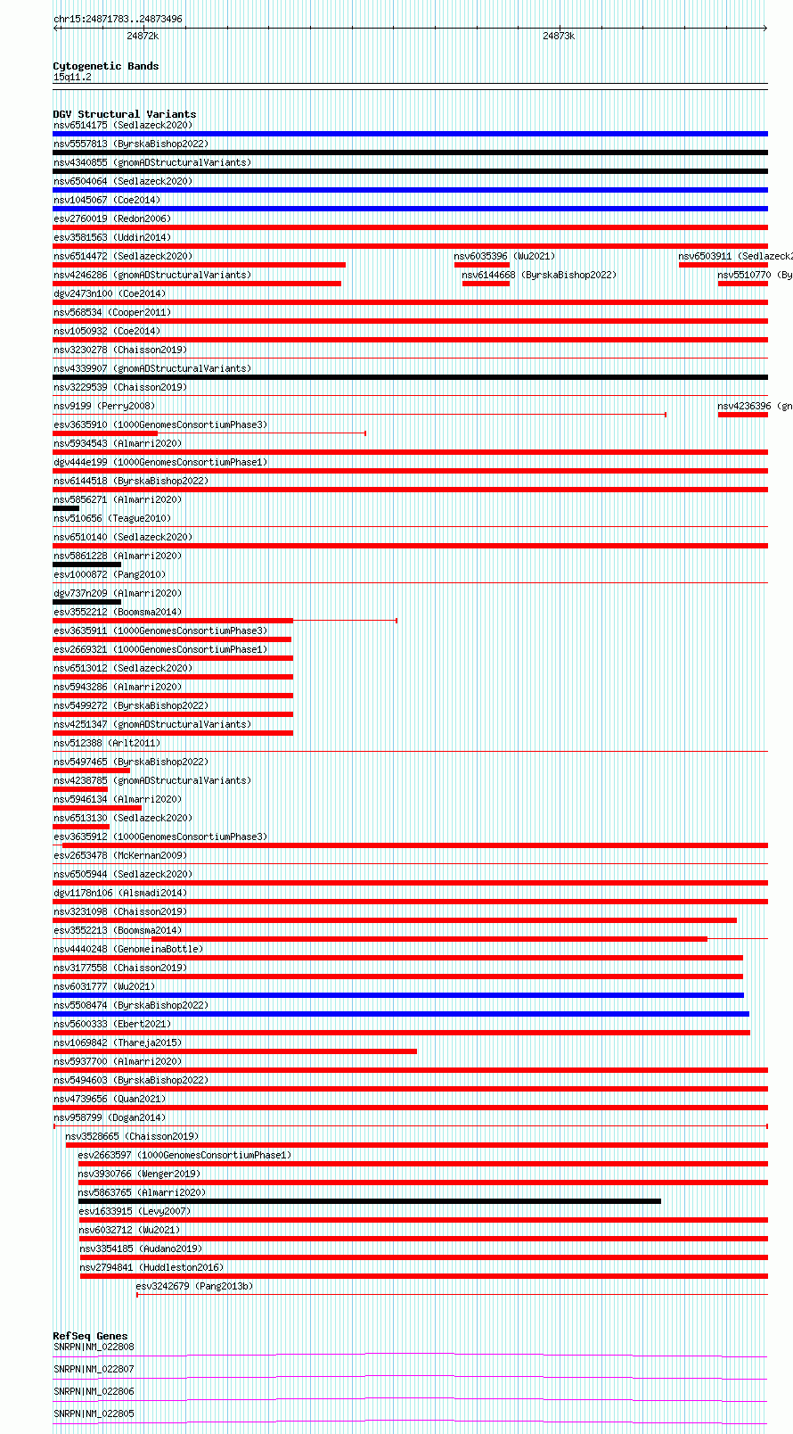 Variant DetailsVariant: nsv958799| Internal ID | 17307672 | | Landmark | | | Location Information | | | Cytoband | 15q11.2 | | Allele length | | Assembly | Allele length | | hg38 | 1714 | | hg19 | 1714 |