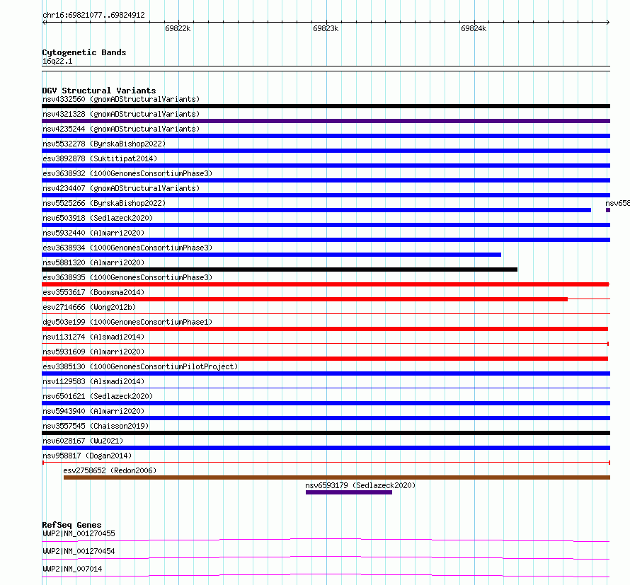 Variant DetailsVariant: nsv958817| Internal ID | 17307690 | | Landmark | | | Location Information | | | Cytoband | 16q22.1 | | Allele length | | Assembly | Allele length | | hg38 | 3836 | | hg19 | 3836 |