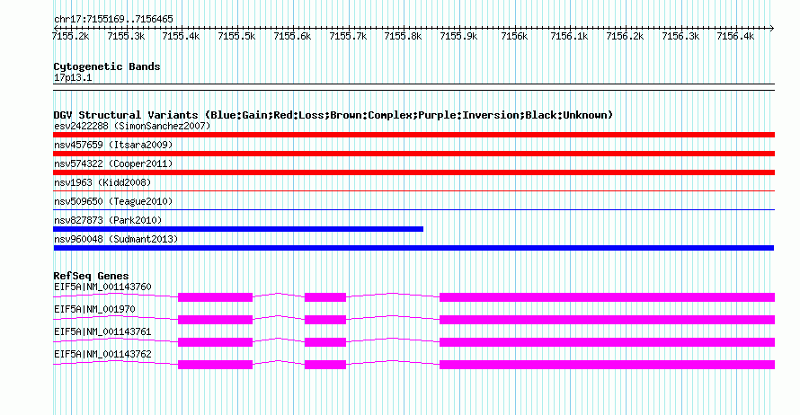 Variant DetailsVariant: nsv960048| Internal ID | 18248615 | | Landmark | | | Location Information | | | Cytoband | 17p13.1 | | Allele length | | Assembly | Allele length | | hg38 | 1297 | | hg19 | 1297 | | hg18 | 1297 |