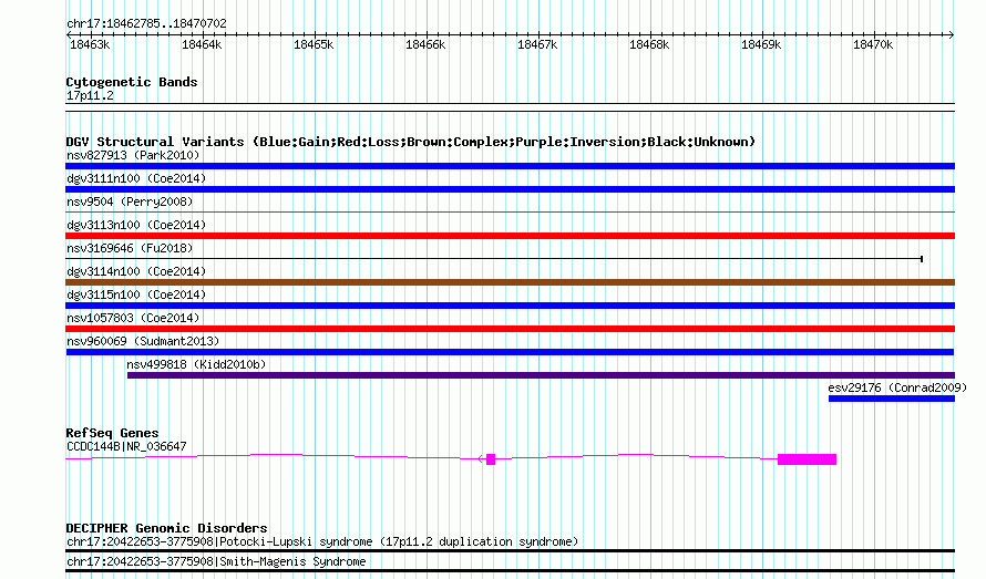 Variant DetailsVariant: nsv960069| Internal ID | 18595322 | | Landmark | | | Location Information | | | Cytoband | 17p11.2 | | Allele length | | Assembly | Allele length | | hg38 | 7918 | | hg19 | 7918 | | hg18 | 7918 |