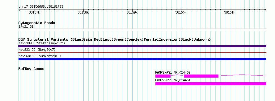 Variant DetailsVariant: nsv960109| Internal ID | 18595362 | | Landmark | | | Location Information | | | Cytoband | 17q21.31 | | Allele length | | Assembly | Allele length | | hg38 | 5066 | | hg19 | 5066 | | hg18 | 5066 |