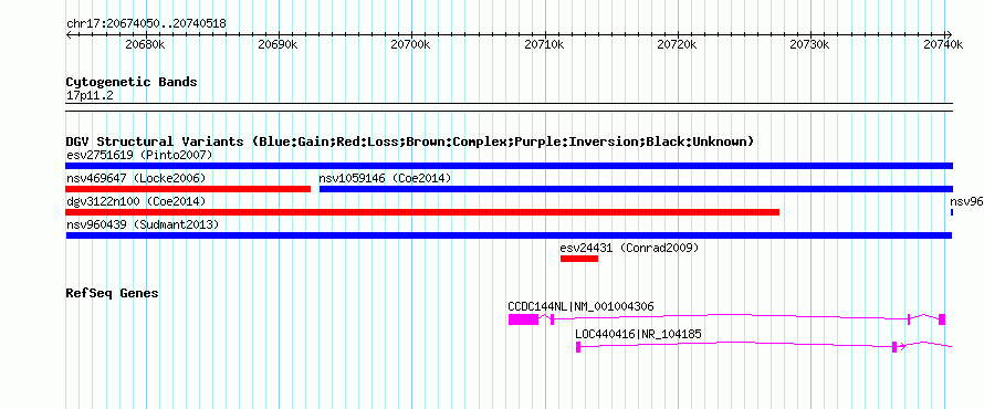 Variant DetailsVariant: nsv960439| Internal ID | 18595690 | | Landmark | | | Location Information | | | Cytoband | 17p11.2 | | Allele length | | Assembly | Allele length | | hg38 | 66469 | | hg19 | 66469 | | hg18 | 66469 |