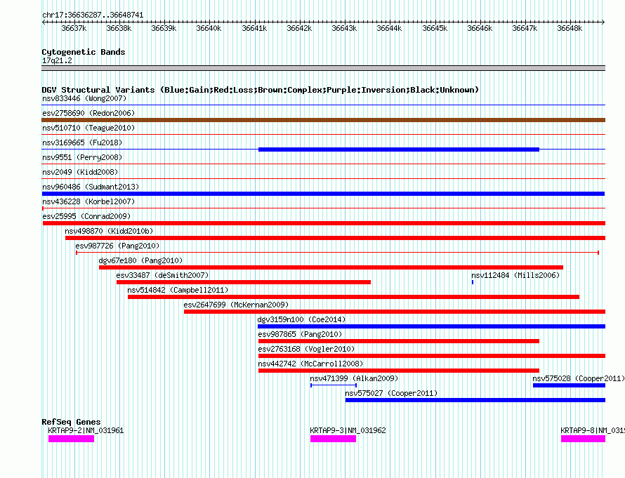 Variant DetailsVariant: nsv960486| Internal ID | 18595737 | | Landmark | | | Location Information | | | Cytoband | 17q21.2 | | Allele length | | Assembly | Allele length | | hg38 | 12455 | | hg19 | 12455 | | hg18 | 12455 |