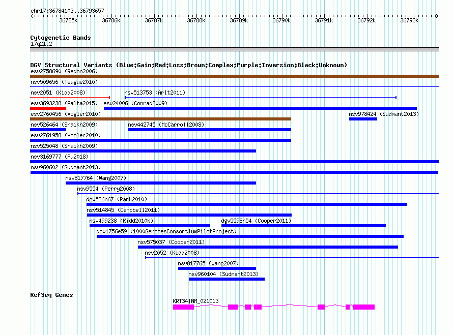 Variant DetailsVariant: nsv960602| Internal ID | 18595850 | | Landmark | | | Location Information | | | Cytoband | 17q21.2 | | Allele length | | Assembly | Allele length | | hg38 | 9555 | | hg19 | 9555 | | hg18 | 9555 |