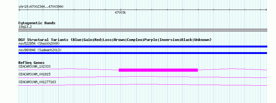 Variant DetailsVariant: nsv960846| Internal ID | 18596093 | | Landmark | | | Location Information | | | Cytoband | 19q13.2 | | Allele length | | Assembly | Allele length | | hg38 | 1600 | | hg19 | 1597 | | hg18 | 1597 |